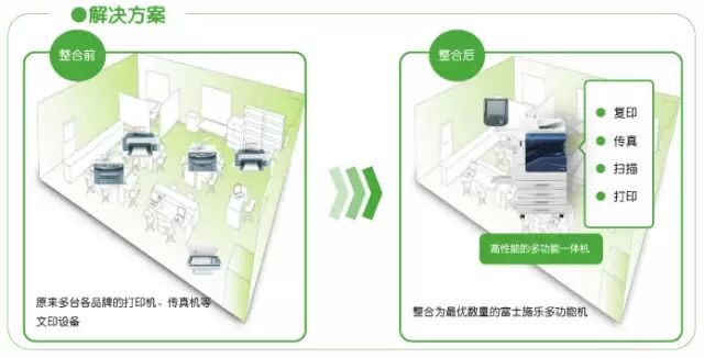 办公室的一天总是忙碌而杂乱的。不同时候采购的设备,品牌用途各不相同。办公室显得越来越拥挤,补充和更换耗材更是费时费力。而高效的办公设备也是提高工作效率、轻松愉悦工作的保障。富士施乐绿印通,将各个功能整合在一台设备内,“打”破杂乱,提高效率,降低管理维护成本。