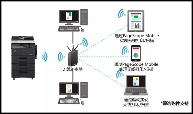 该系列可利用PageScope Mobile软件实现与智能手机及平板设备之间的稳定连接,在内部无线网络环境中利用移动设备可直接打印文档与图片、获取扫描数据。