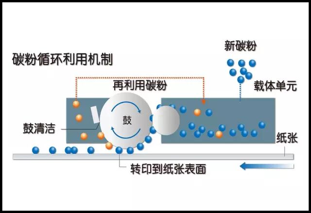 采用废粉循环机制,针对没有吸附在纸张上的碳粉进行100%的回收利用。使用Simitri碳粉,降低碳排放。