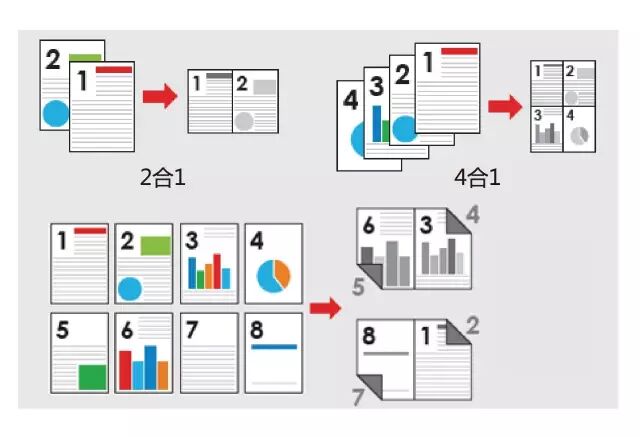 可将多个页面(2 页或4 页)原稿整合到1 个页面上输出。配合双面器,可以实现各种页面组合方式,有效节约纸张,降低办公成本。